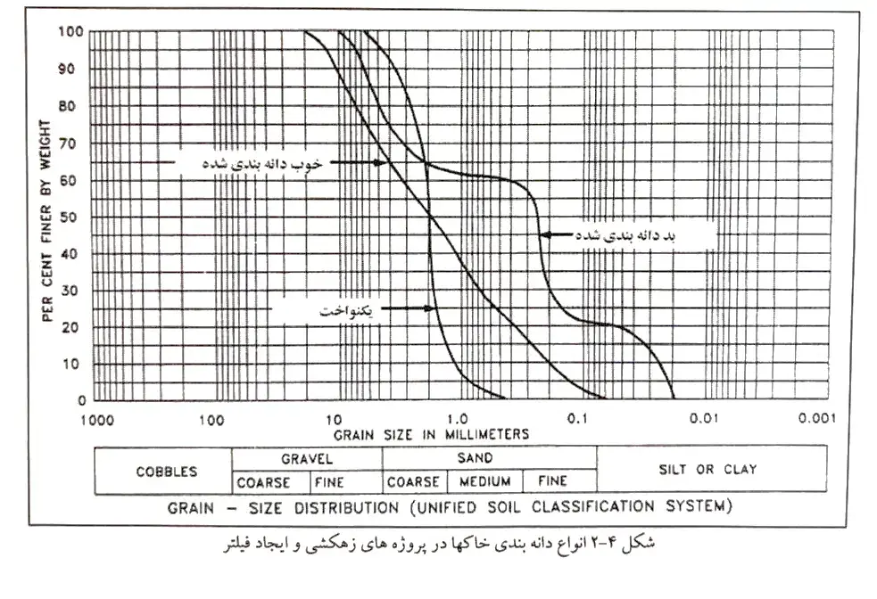 در شکل ۴-۲ مفهوم خاک بد دانه بندی شده خوب دانه بندی شده و با دانه بندی یکنواخت نشان داده شده است.