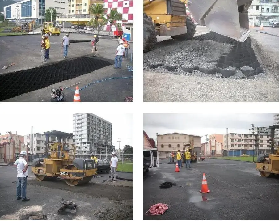 - فشرده سازی:سیستم ژئوسل مستلزم فشرده سازی است. رایجترین روش فشرده سازی عبور مکرر غلتک از سطح شبکه (پس از پر شدن سلولها با مصالح مناسب) است اما برای رسیدن به تراکم مشخص، ممکن است یک وسیلهی دیگر یا آب مورد نیاز باشد.